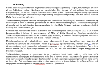 Oktober 2025: Modelberegning af trafikudviklingen 2022-70 i basisscenariet uden Østlig Ringvej eller Nordhavn-Lynetteholm Juni 2025: Trafikmodelberegninger for Østlig Ringvej Januar 2025: Beregningsforudsætninger for 2035, 2040, 2050 og 2070