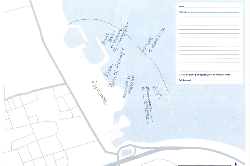 Derfor var første opgave for de mange fremmødte at fordele sig i grupper og fortælle om, hvilke funktioner havneområdet dækker, og hvilken betydning området har for borgerne i dag. Alle input blev noteret på post-its og samlet ude ved bordene.
